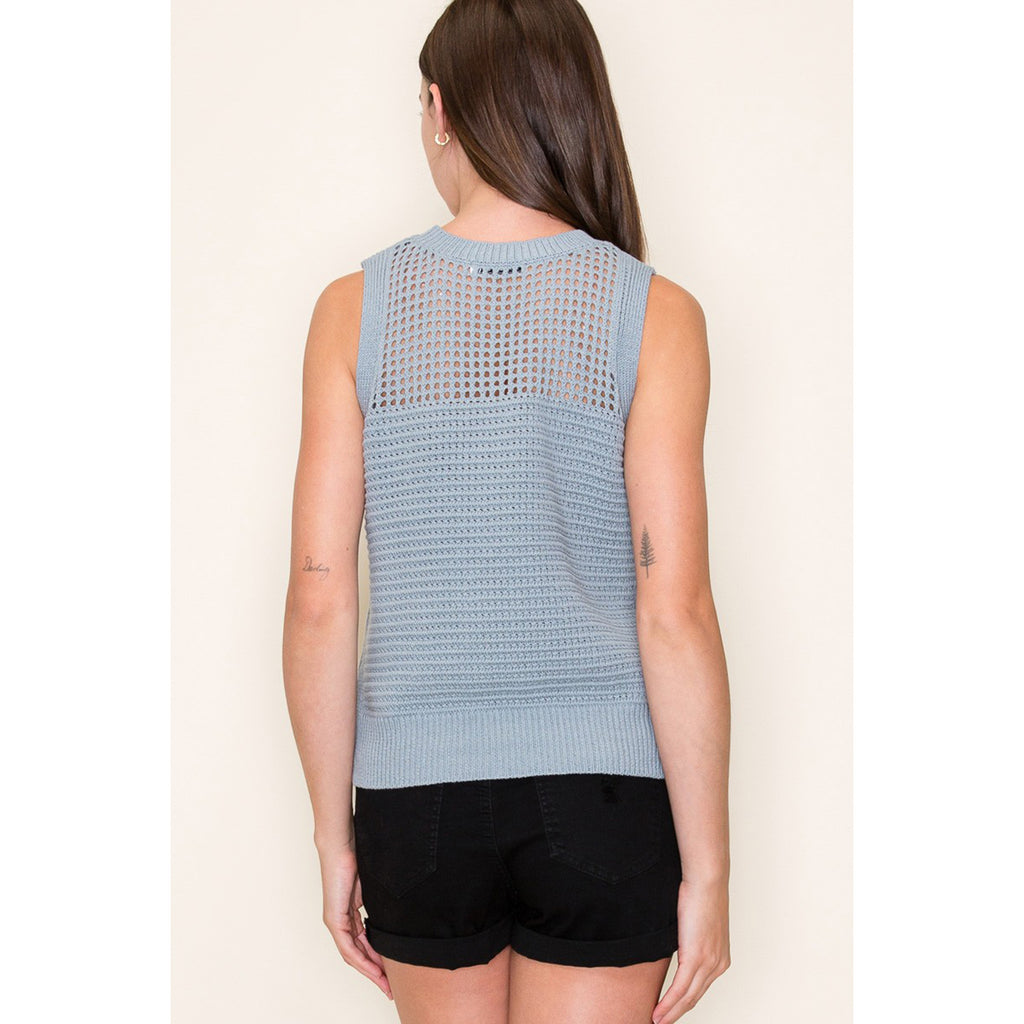 Expertly crafted in soft, breathable pointelle knit, this dusty blue sweater vest adds a touch of effortless elegance to any outfit. Its intricate details and versatile design make it a must-have for layering and staying stylishly comfortable all day.