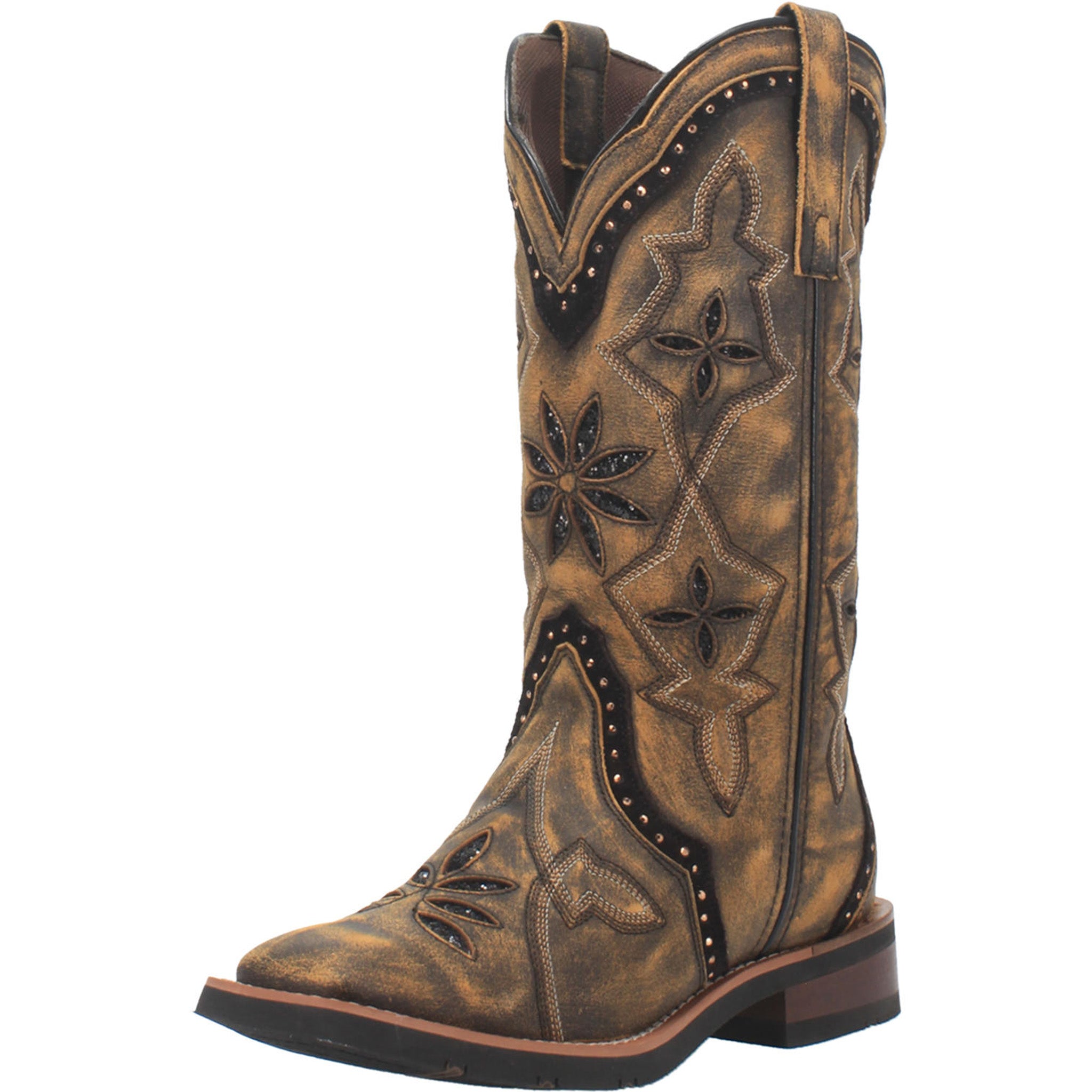 Calling all cowgirls! The Laredo Bouquet boot is "pretty" sensational. The all leather boot has a detailed stitch design with studded borders and glitter underlays. Cushion comfort insole, flexible rubber outsole and stockman heel.