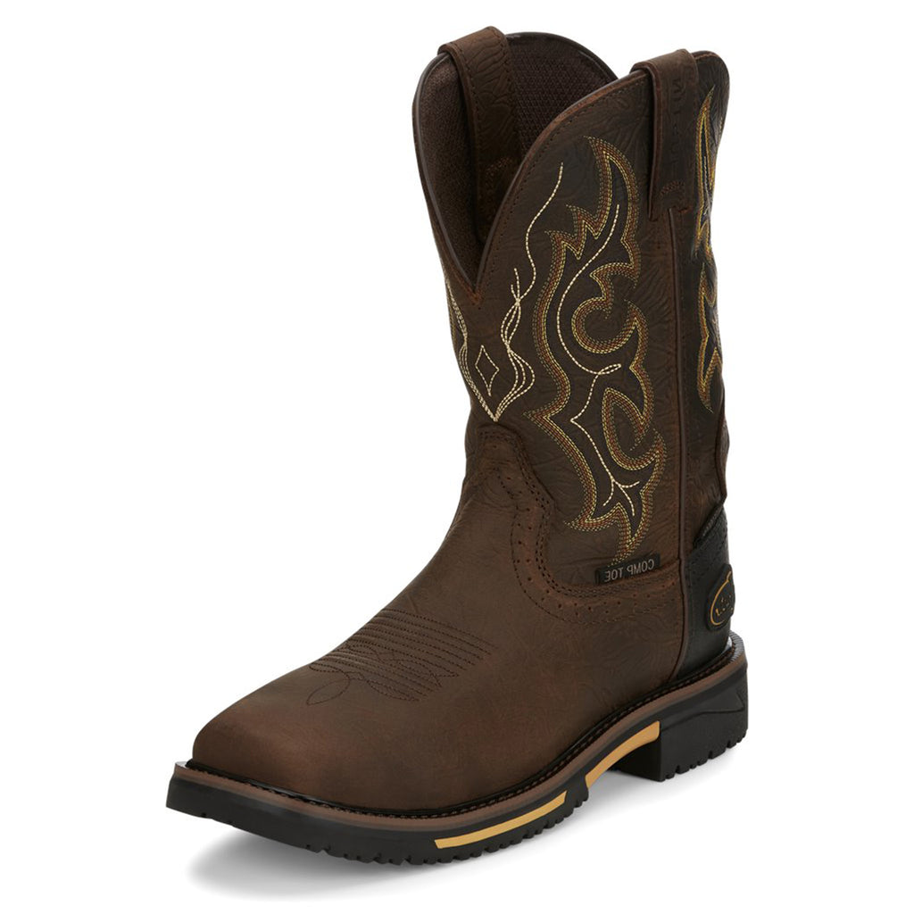 The Joist Composite Toe 11" tall Men's Hybrid work boot is built for durability. The rustic brown leather exterior is waterproof and accented by a simple stitch pattern along the upper. The composite toe provides security and comfort and meets safety standards without weighing you down. Its multi-density rubber and EVA combination outsole offers lightweight durability and meets the standards for electrical hazard footwear, so you are guaranteed protection against open circuits of up to 18,000 volts. This boot also provides an Achilles Relief System® that eliminates weak spots in foot comfort by using stretchable material, high-density foam, and moisture-wicking anti-microbial lining to provide flexibility, support and breathability.