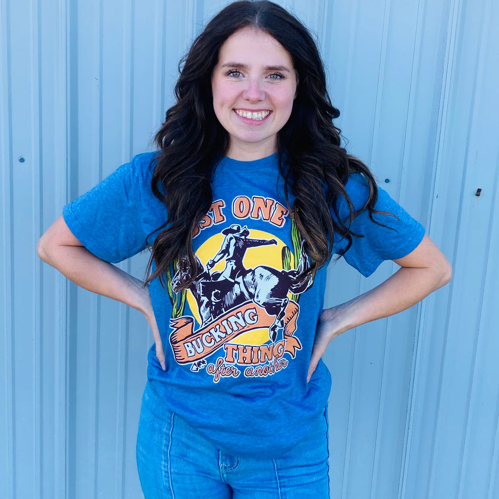 This graphic tee is a must have for so many reasons! It gives off all the western feels you would want with this fun font and awesome bucking bronc graphic.