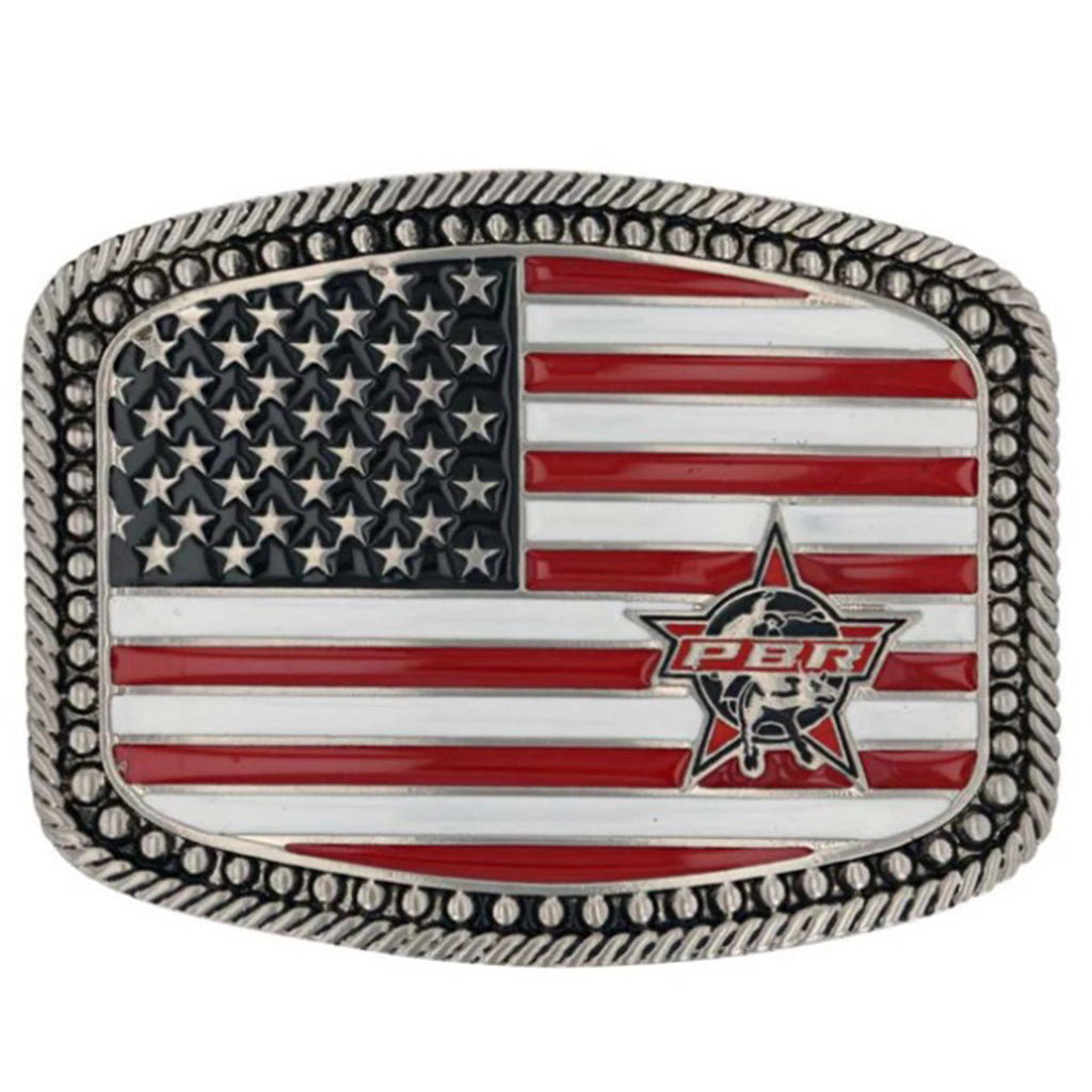 Show your pride and support with the PBR American Flag Belt Buckle. Combining the iconic American flag with the spirit of Professional Bull Riders, this durable buckle is a meaningful way to express your love for the sport and your country. It offers reliable wear and a bold statement for every rodeo fan.