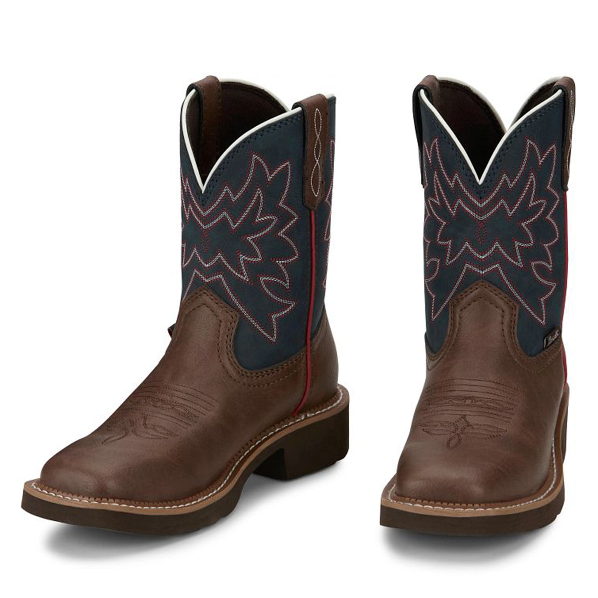 Stylish and comfortable, the Justin women's Sunny dark navy & brown square toe boots are perfect for any occasion. These boots feature a beautiful navy and brown color combination, a square toe design, and are made with high-quality materials for durability. Elevate your outfit with these sturdy boots.