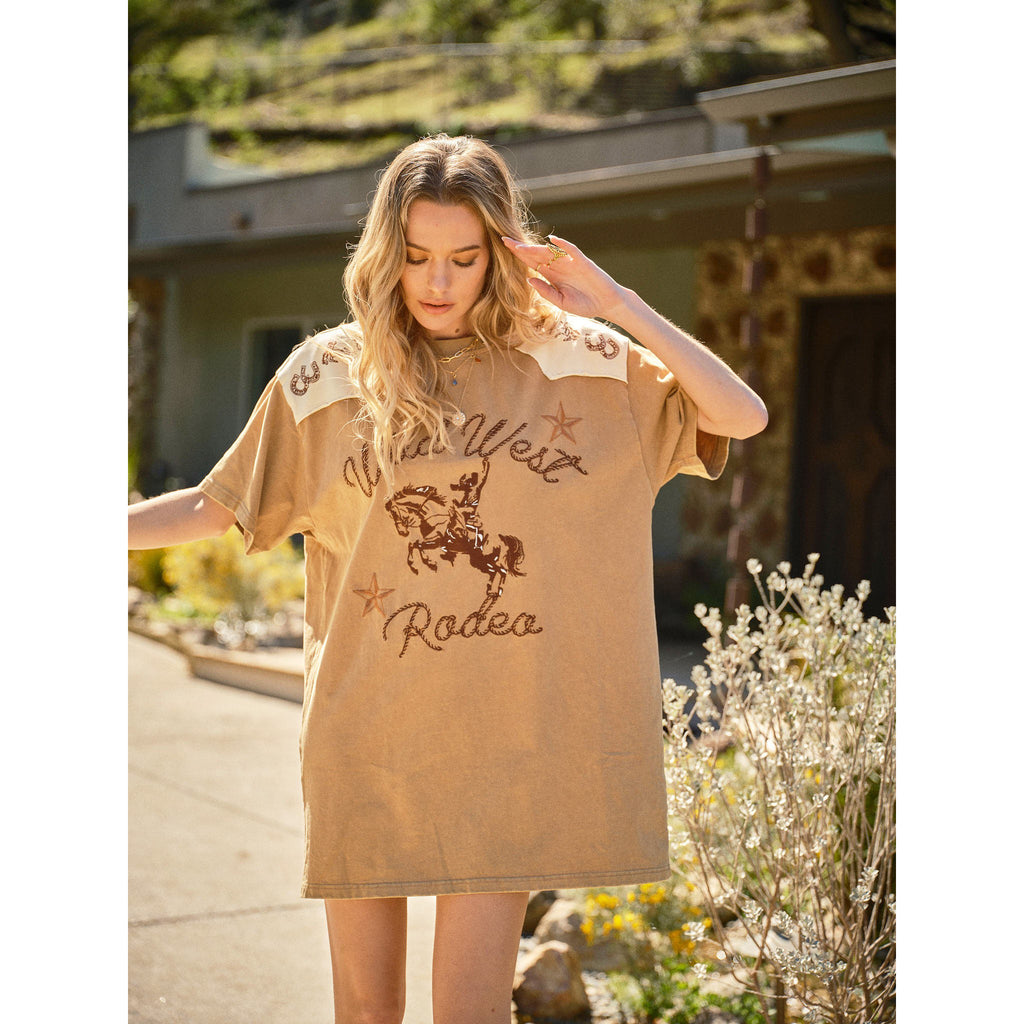 Make a statement in the Blue B Women's Taupe Rodeo Embroidery Dress! This oversized t-shirt style dress is playfully decorated with rodeo-inspired embroidery on soft taupe fabric, adding a dash of western charm to your look. Its relaxed fit lets you move freely as you dance, twirl, and soak up every fun moment. Ideal for casual days or lively events, this dress brings a lively, head-turning energy wherever you go.