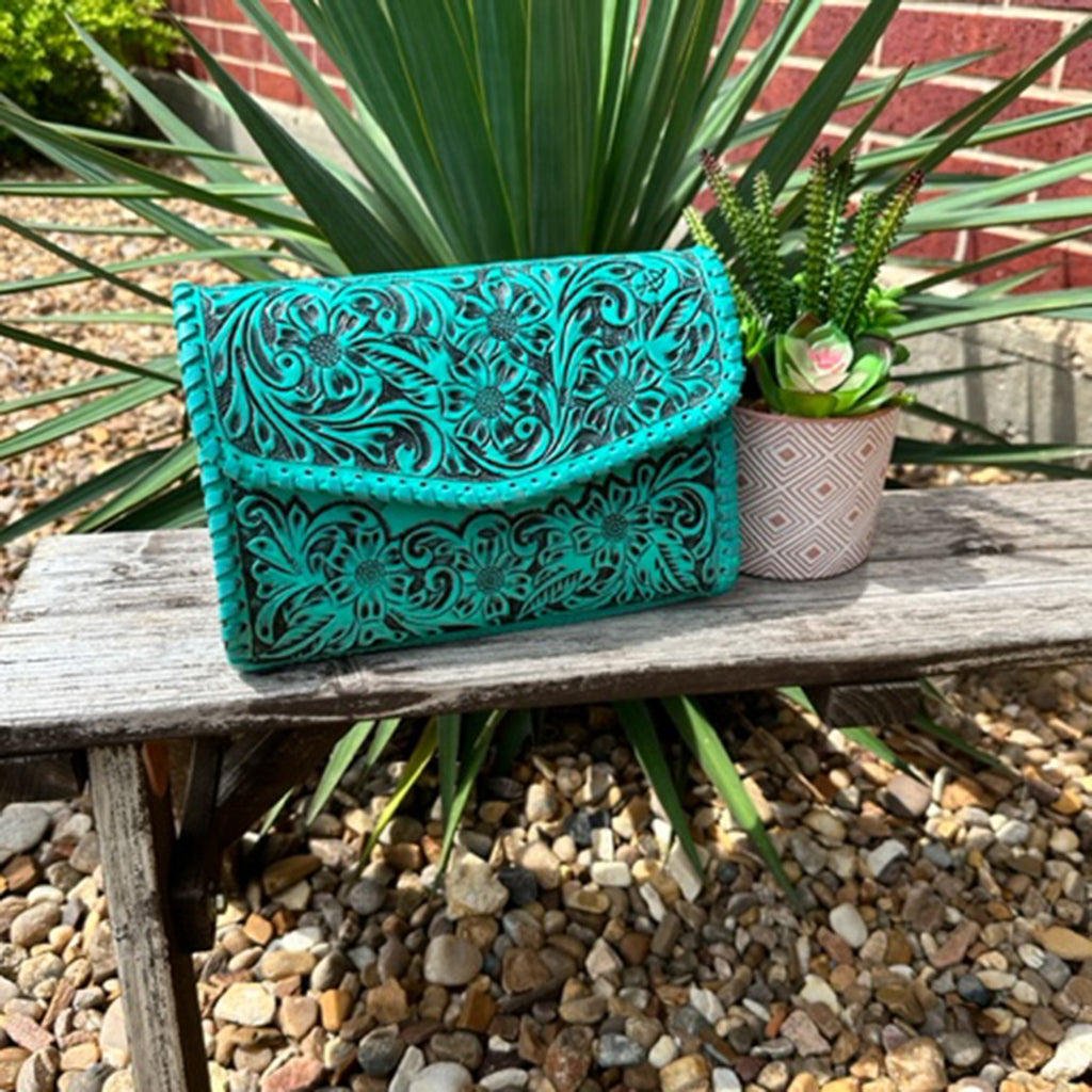 Hello Beautiful!! This stunning Turquoise fully tooled clutch, from American Darling, is a MUST HAVE for any Western Fashionista. This is defiantly a Western Edge favorite. It comes with a removable/adjustable strap so you can carry as a clutch or a crossbody!