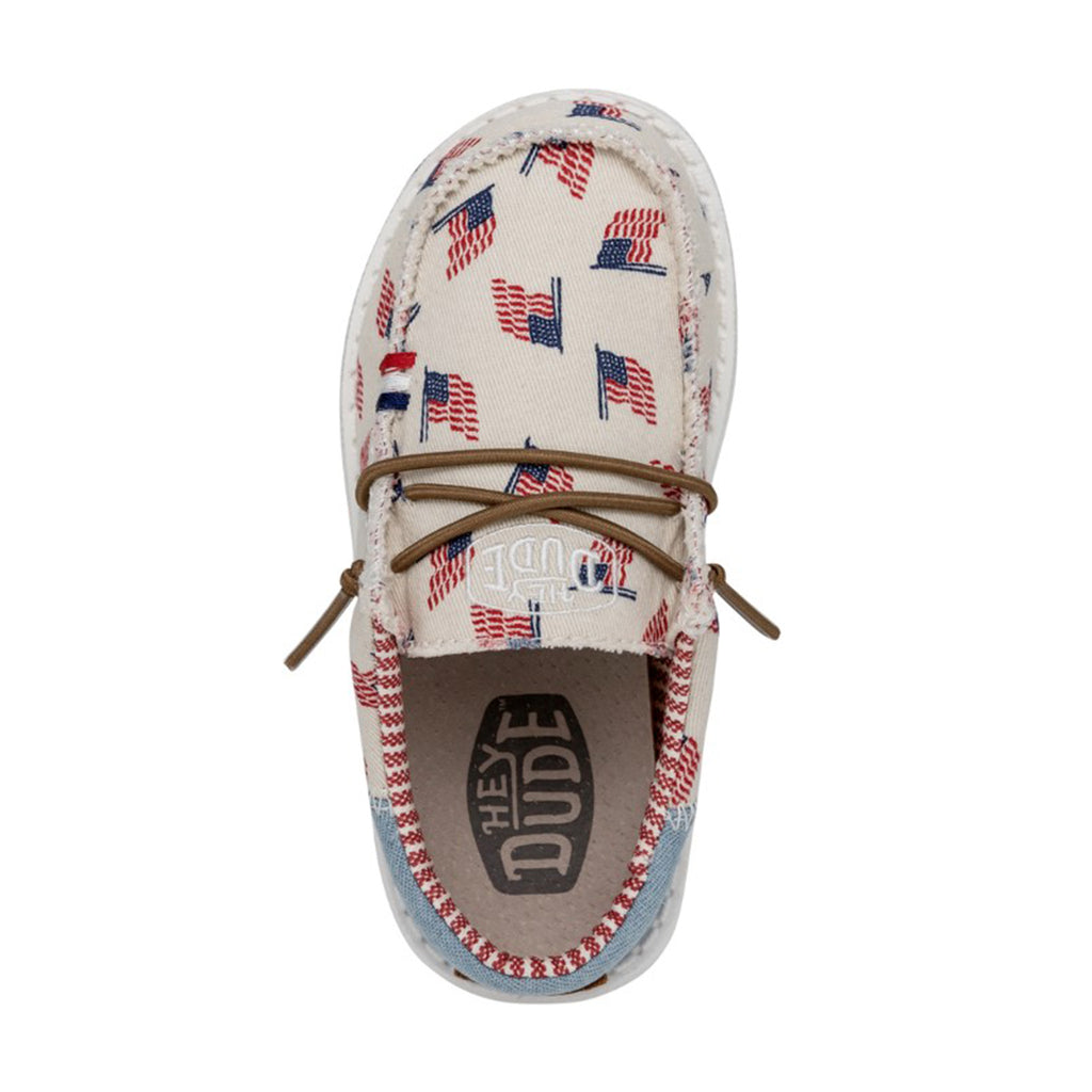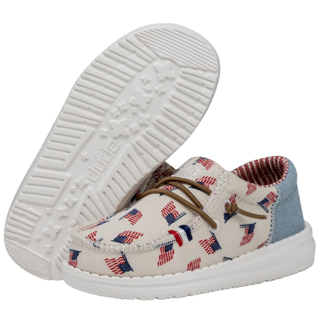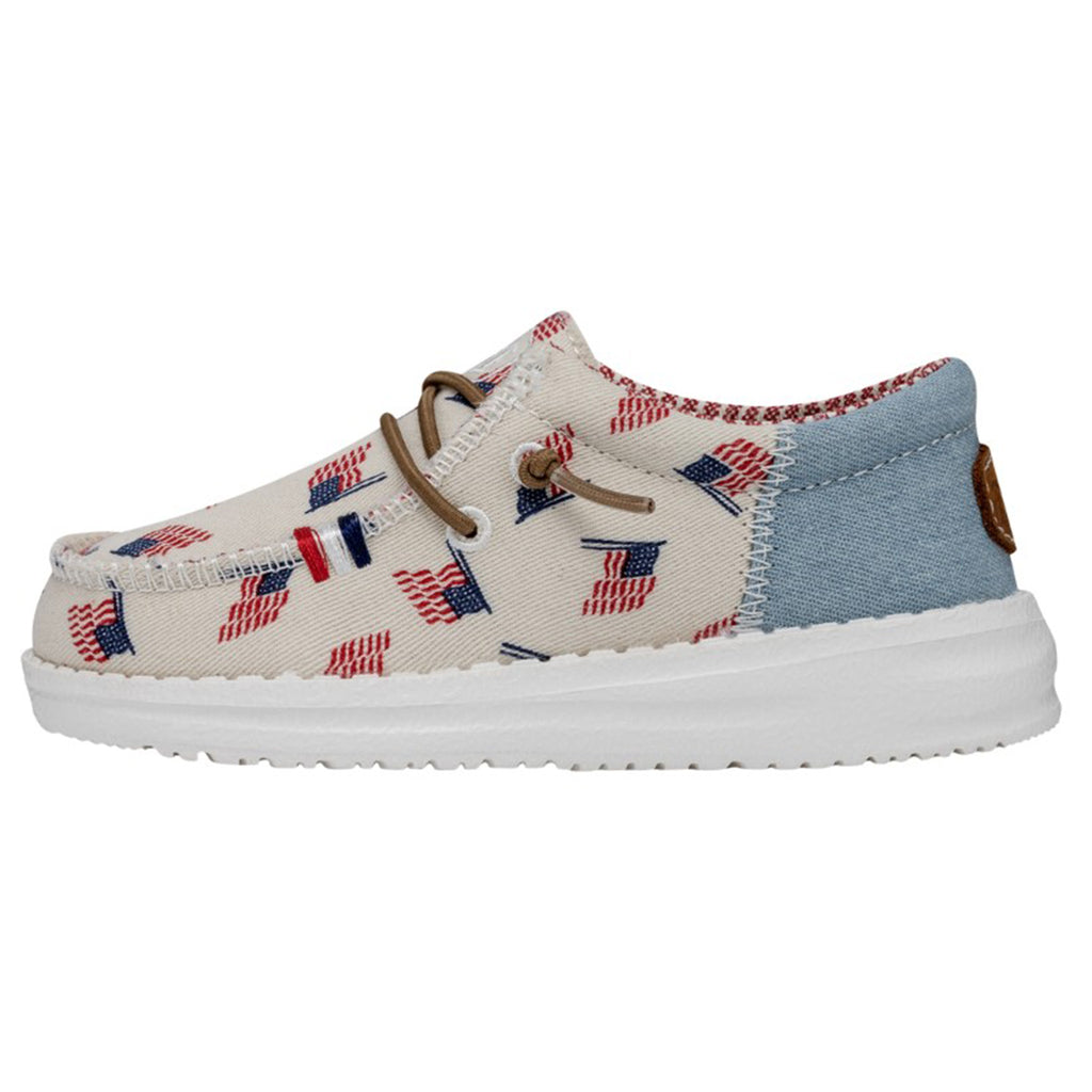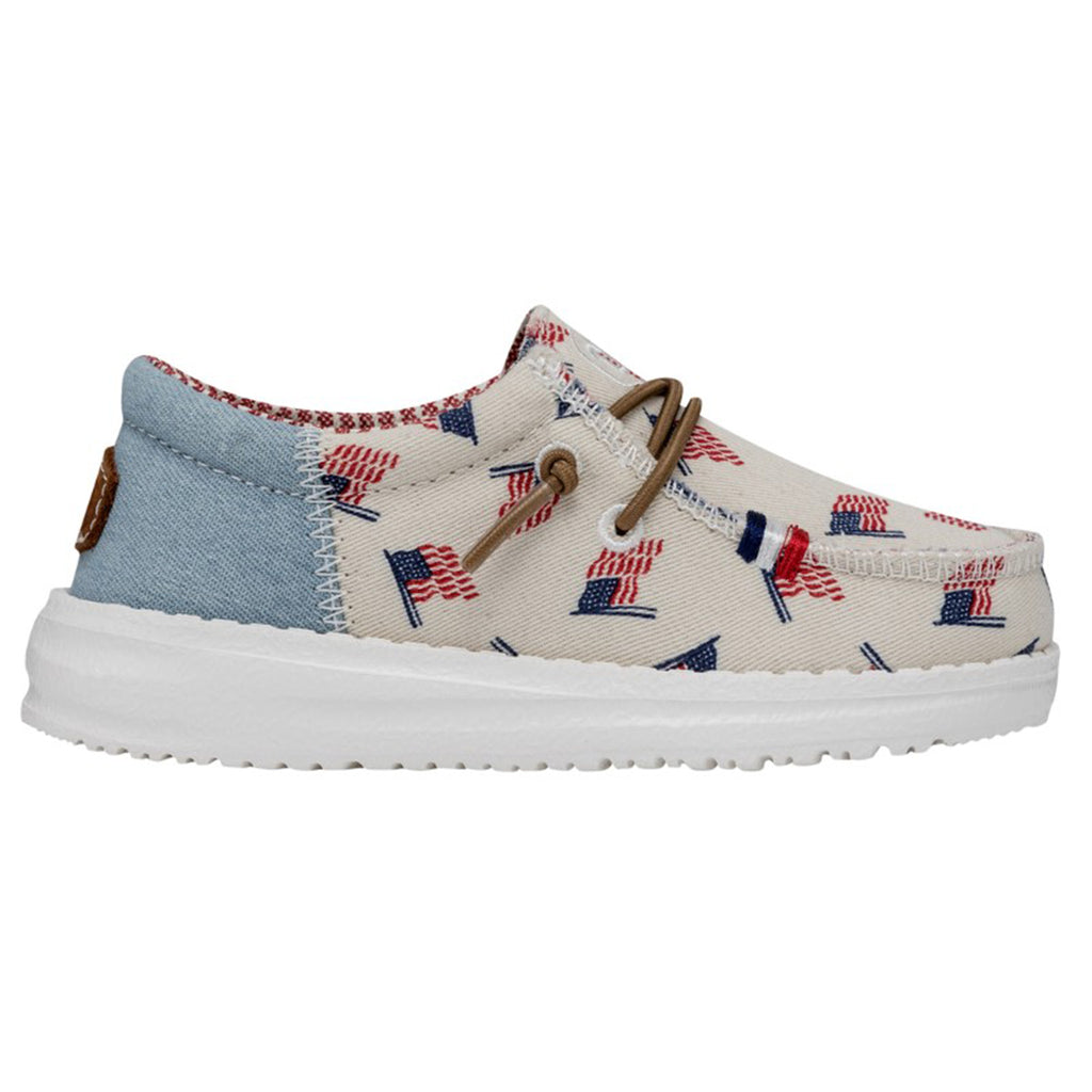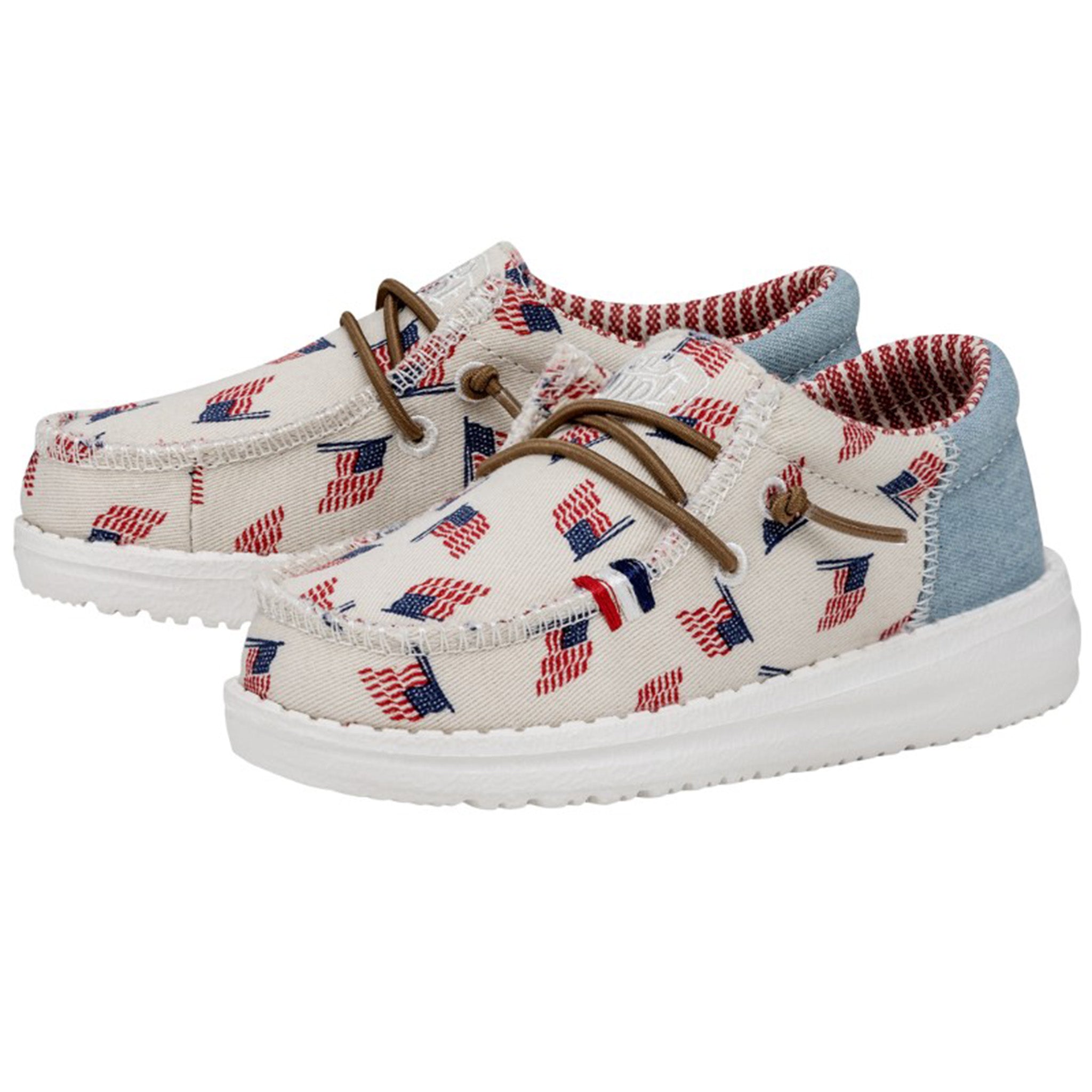 Dress up your toddler in red, white & cool blue...The Wally Americana takes a popular moc and adds pops of patriotic colors and patterns. A textile upper stands up to adventures for days. And an easy-on, easy-off lace system lets foot freedom ring.