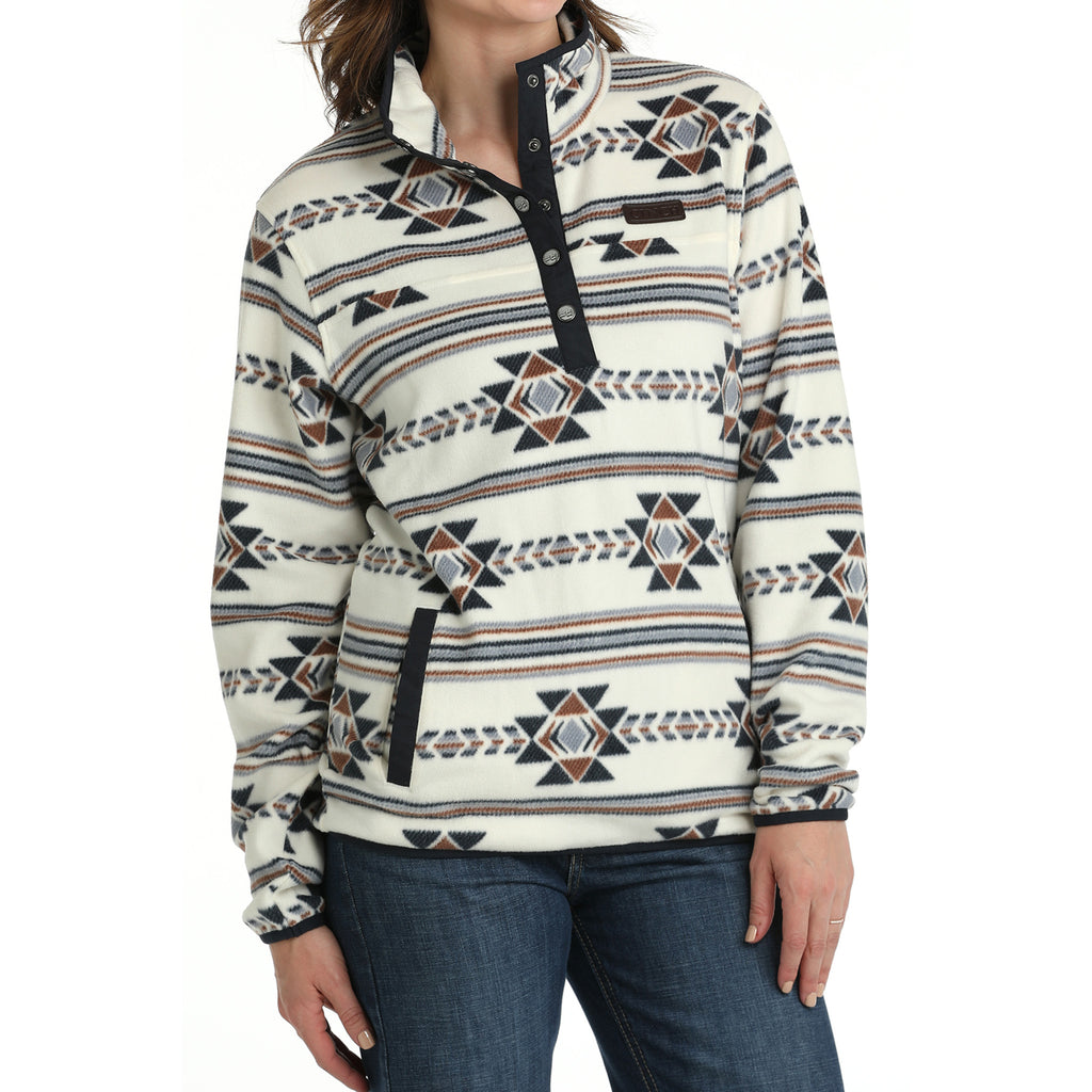 Transform your outdoor style with Cinch's Cream Polar Fleece Pullover. It combines sophisticated design with unbeatable comfort. Made with a blend of poly-spandex, this pullover includes a quarter snap placket, exterior pockets, and a faux leather logo patch.